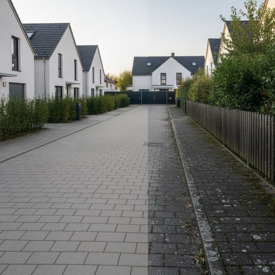 Im Gegensatz zu herkömmlichen Hochdruckreinigungen arbeiten wir materialschonend und immer mit einem klaren Ziel: ein dauerhaft sauberes Ergebnis. Deshalb kombinieren wir jede Reinigung mit einer fachgerechten Neuverfugung (bei Pflasterflächen) sowie einer Imprägnierung oder Versiegelung für Langzeitschutz.